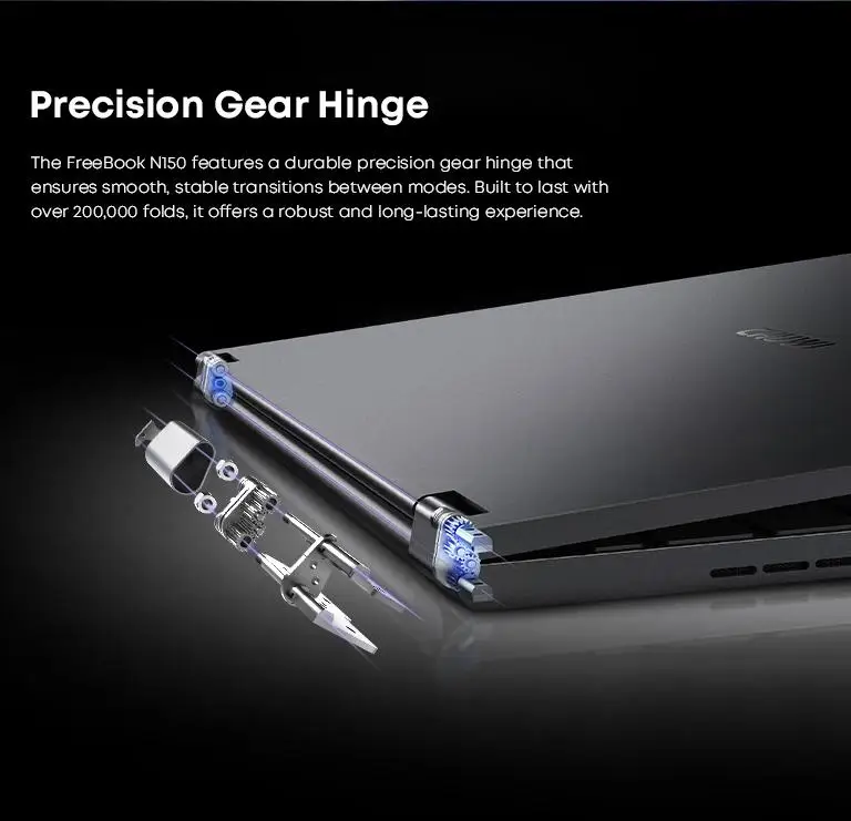The FreeBook N150 features a durable precision gear hinge thatensures smooth, stable transitions between modes. Built to last withover 200,000 folds, it offers a robust and long-asting experience.